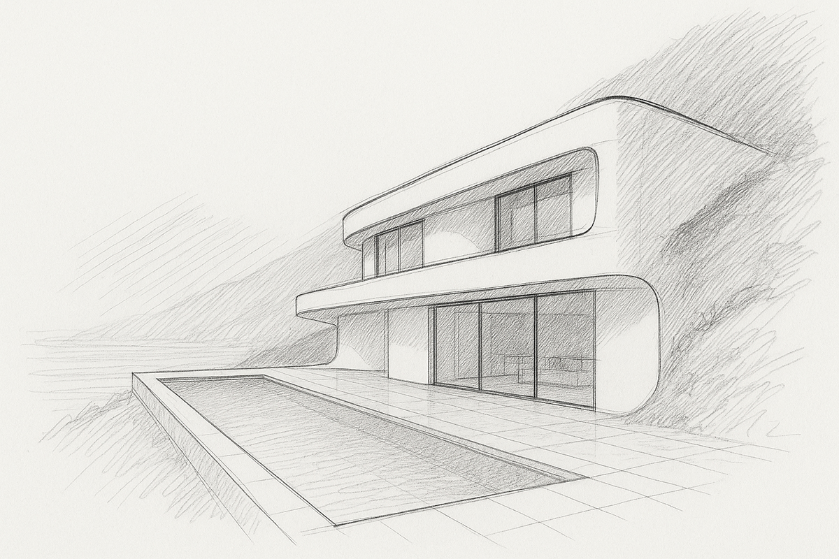 El proyecto nace de una premisa clara: integrar la vivienda en la ladera sin imponerse al entorno, dejando que la arquitectura dialogue con el horizonte, el mar y la pendiente natural del terreno.