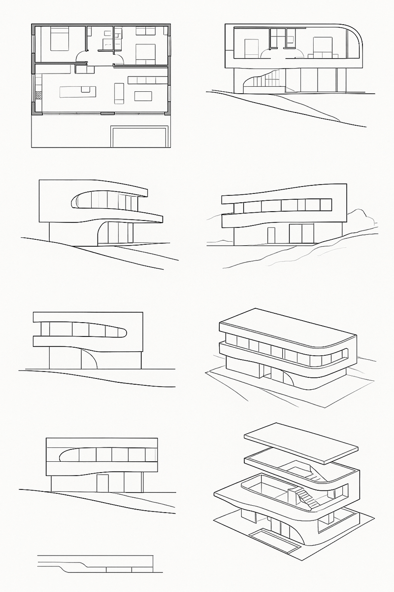 Las curvas suaves y los bordes redondeados modelan una volumetría continua, orgánica, que suaviza la presencia de la casa sobre el acantilado, como si el viento y el agua la hubieran ido esculpiendo con el tiempo.