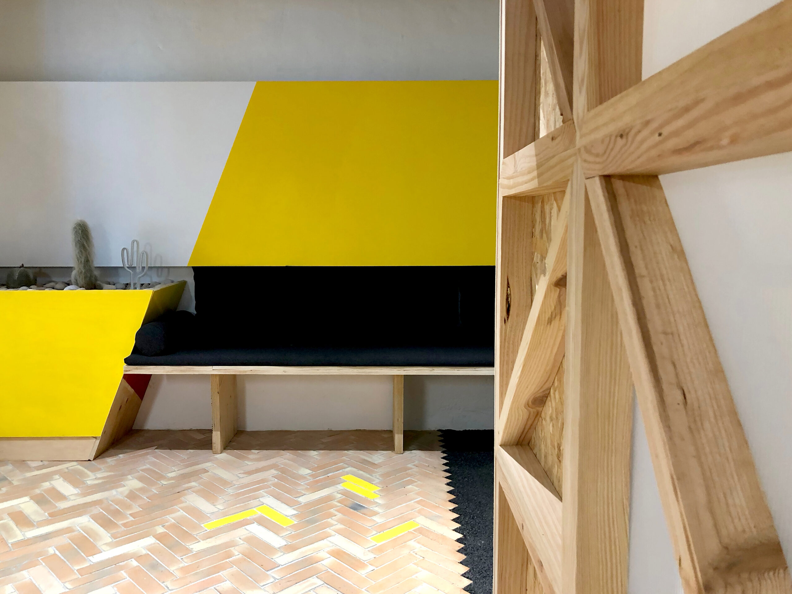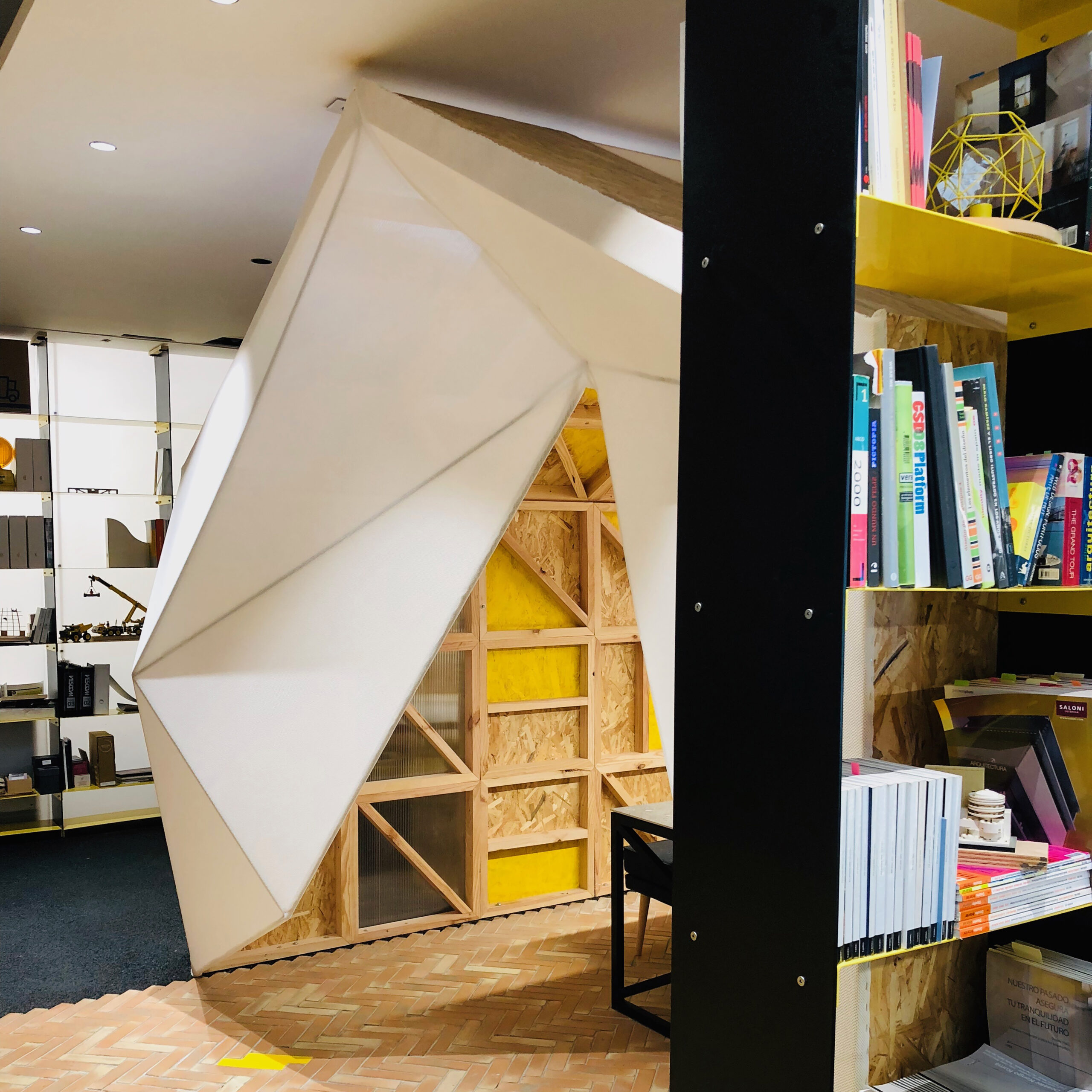 Esta pequeña “arquitectura dentro de la arquitectura” simboliza la idea de hogar creativo, un espacio abierto y acogedor donde las ideas se cruzan y toman forma.