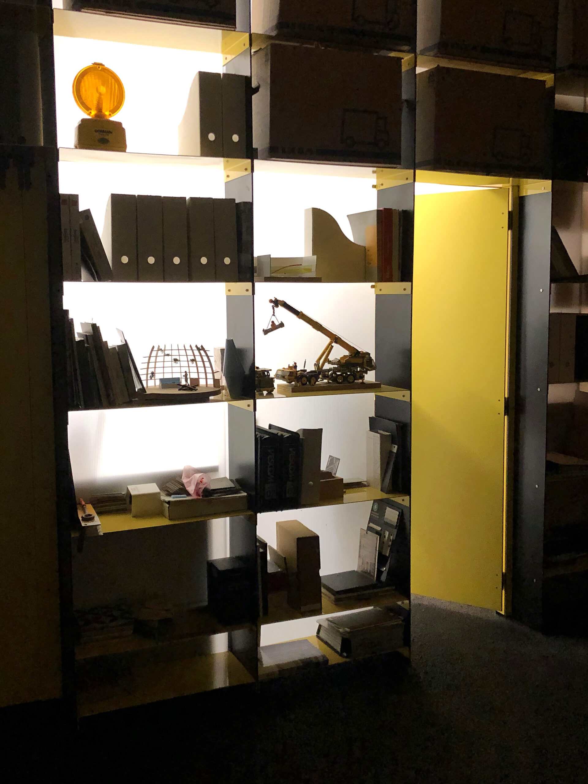 El suelo de asfalto negro se convierte en el protagonista del espacio: una superficie continua que evoca el paisaje urbano y define la circulación interior. Sobre él, líneas blancas marcan la posición de ciertos muebles y elementos de trabajo, como si fueran viales de una carretera, dotando al conjunto de orden y dinamismo.